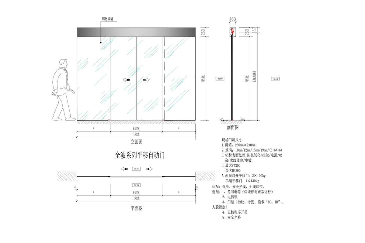 產品名稱:全玻自動門 安裝位置:室內/室外 開啟形式: 自動、遙控、感應、刷卡 門扇材質: 鋼化玻璃 洞口完成面尺寸:可定制 標配:圣達宸驅動系統、探頭、安全光線、無線遙控。 選配:各大品牌驅動系統均可匹配 1、備用電源(保證停電正常運行) 2、電插鎖 3、門禁(指紋、考勤、讀卡“IC、ID”、人臉識別) 4、五檔程序開關 5、安全光幕